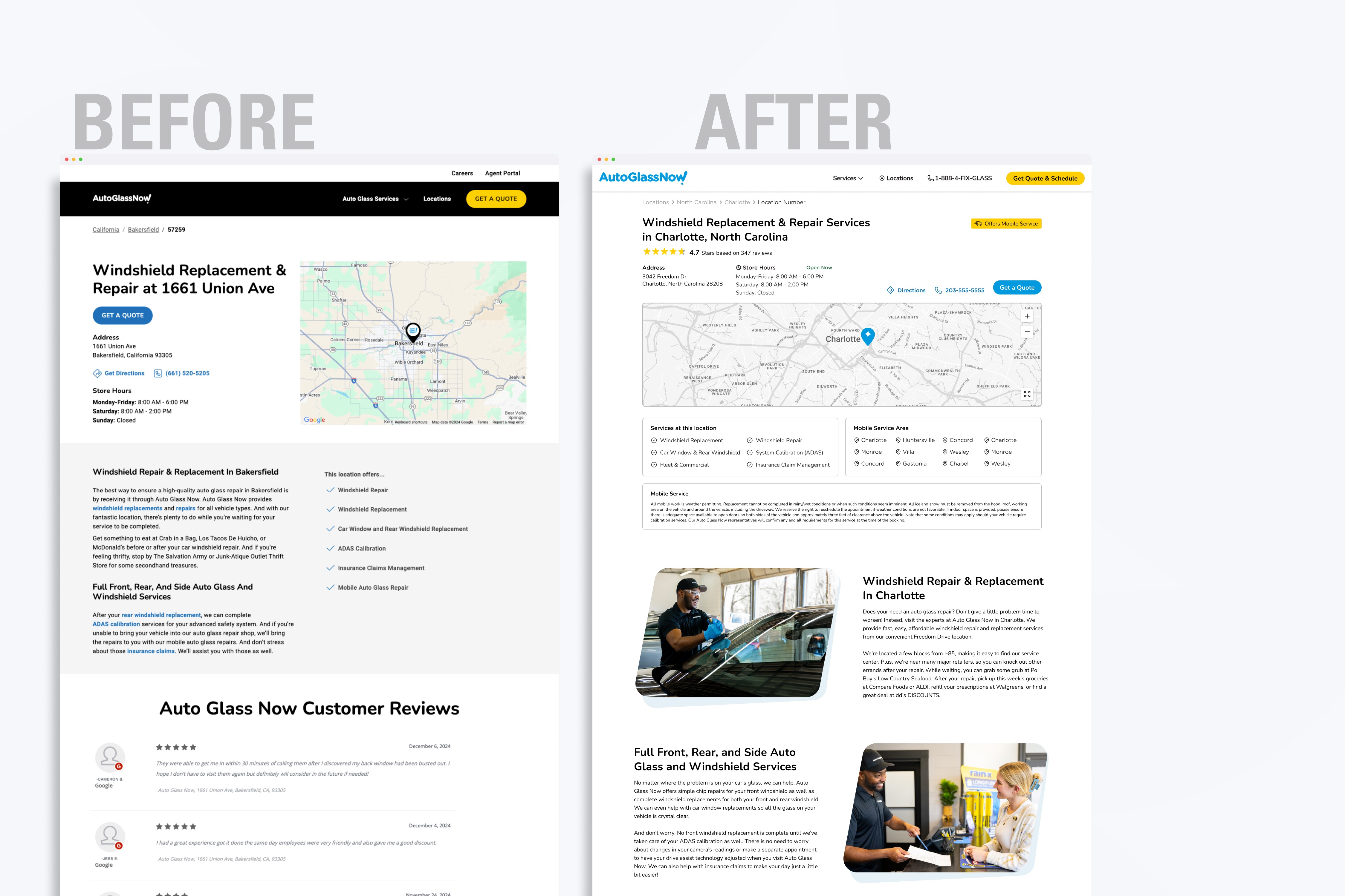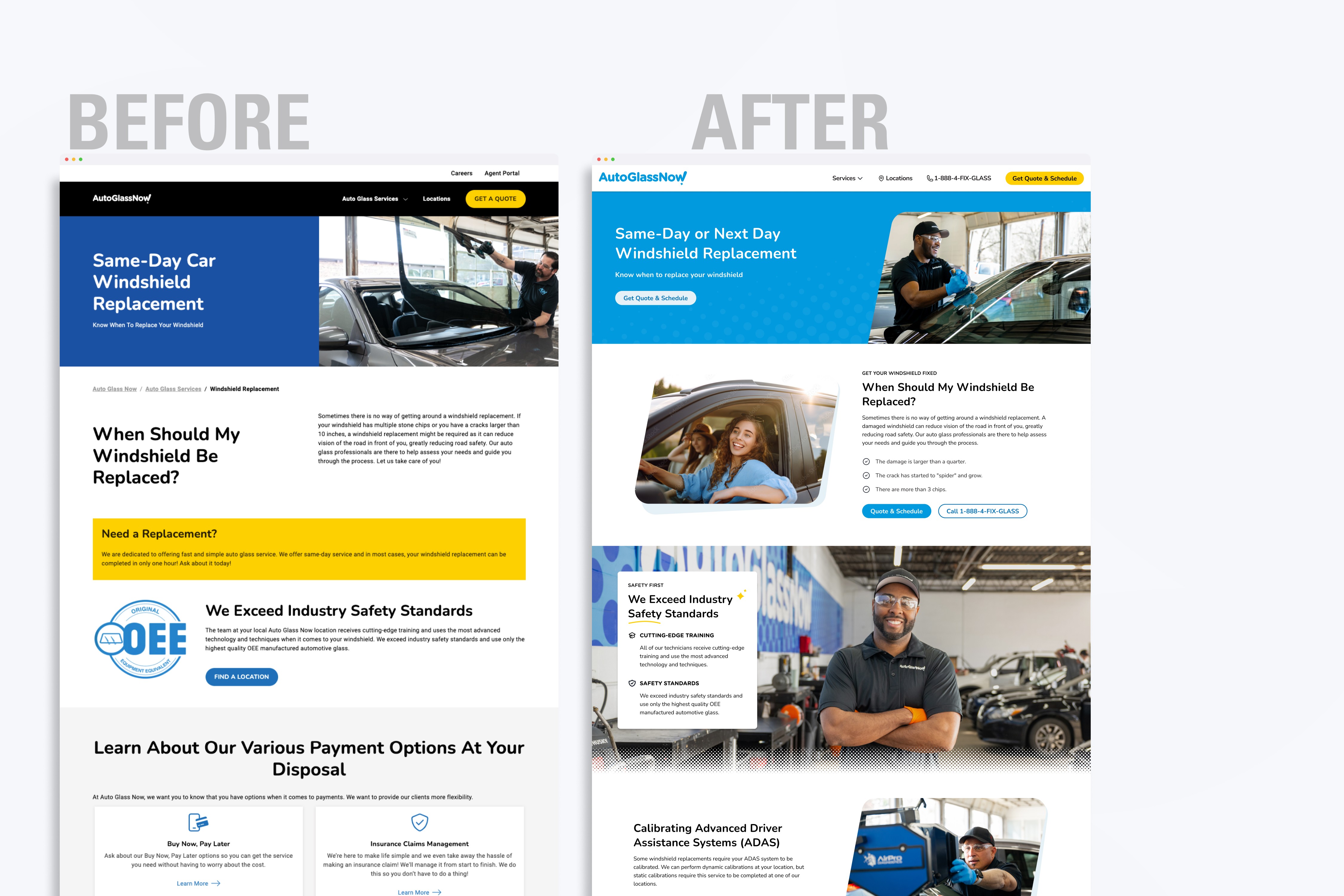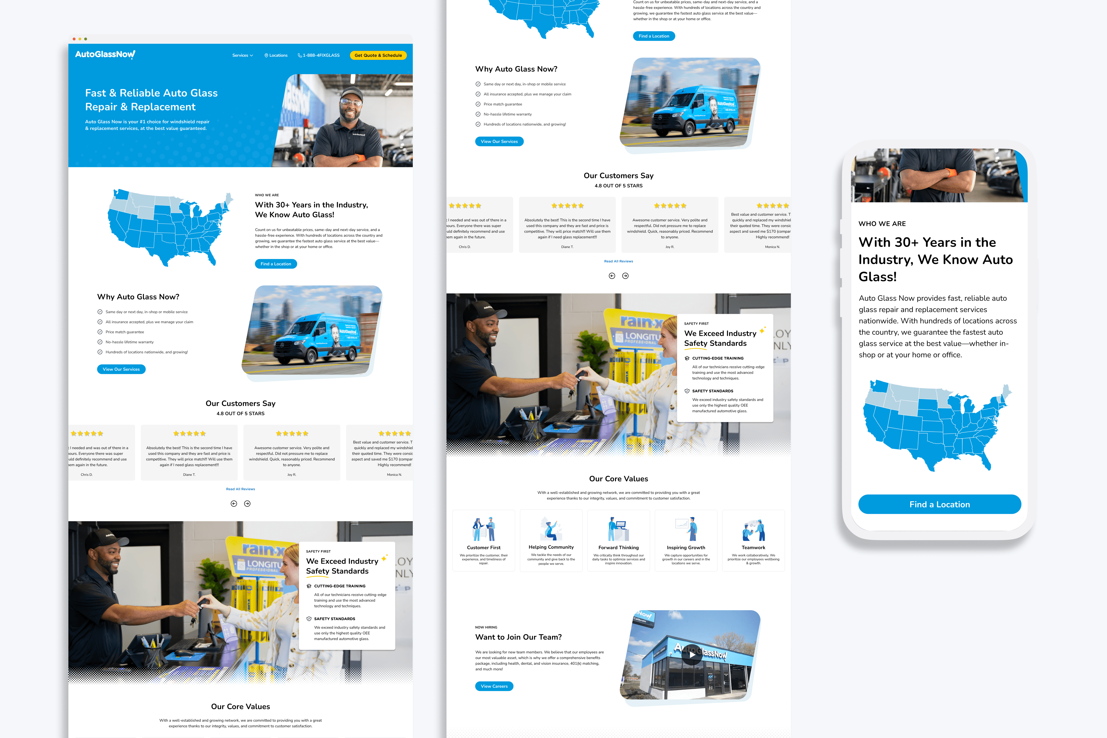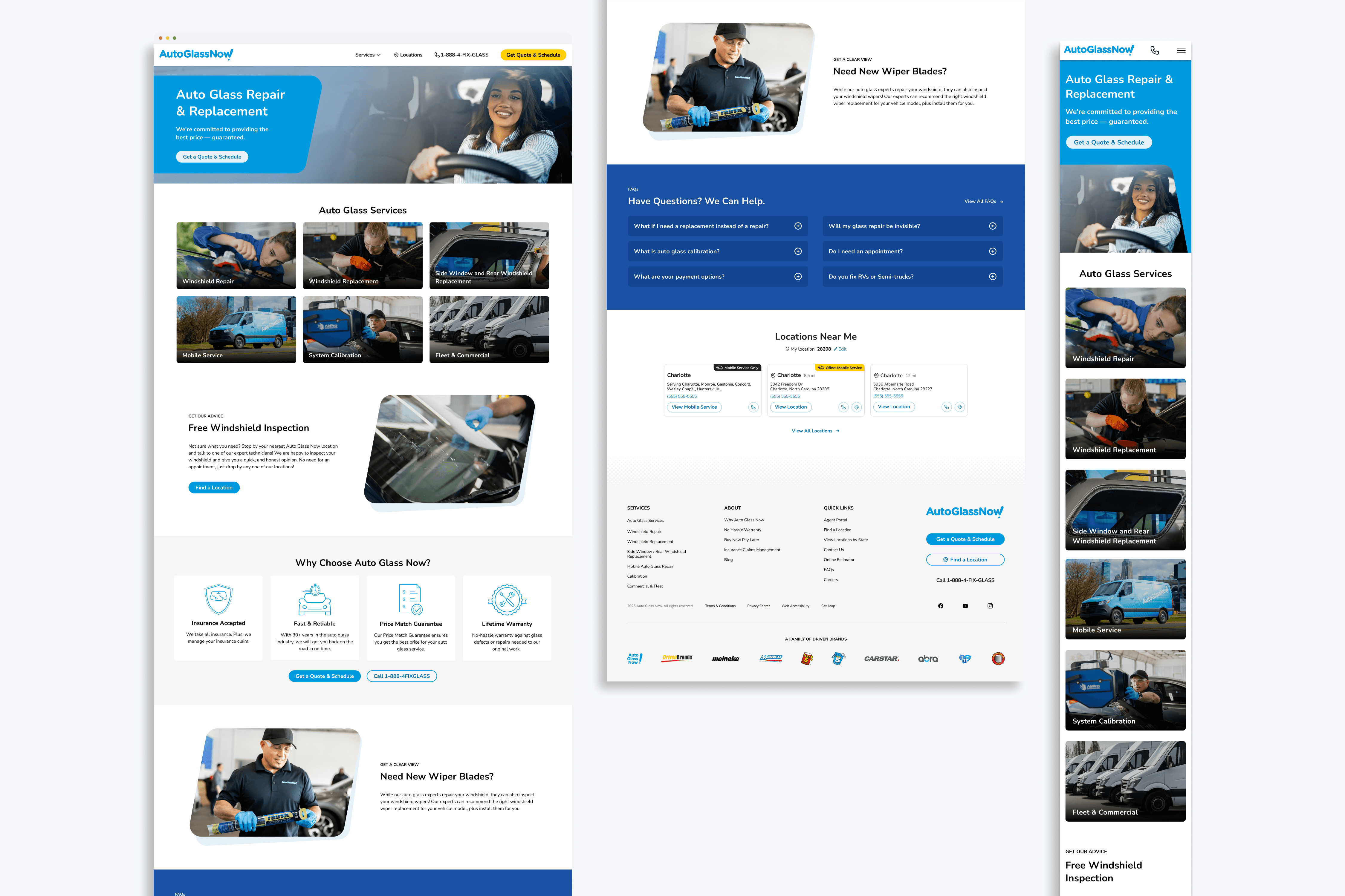 The project required balancing multiple priorities: creating an intuitive user experience for customers seeking immediate service, establishing a flexible content management system for the internal team, and building a technical foundation that could grow with the business. By approaching the redesign strategically, starting with research and information architecture before moving to visual design—we ensured every design decision supported both user needs and business goals.The result was a complete digital transformation that modernized every aspect of the Auto Glass Now web presence. From homepage to service pages, the new site delivered a cohesive brand experience while making it easier than ever for customers to find information, get quotes, and schedule service.